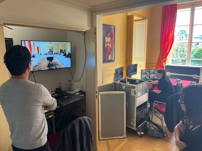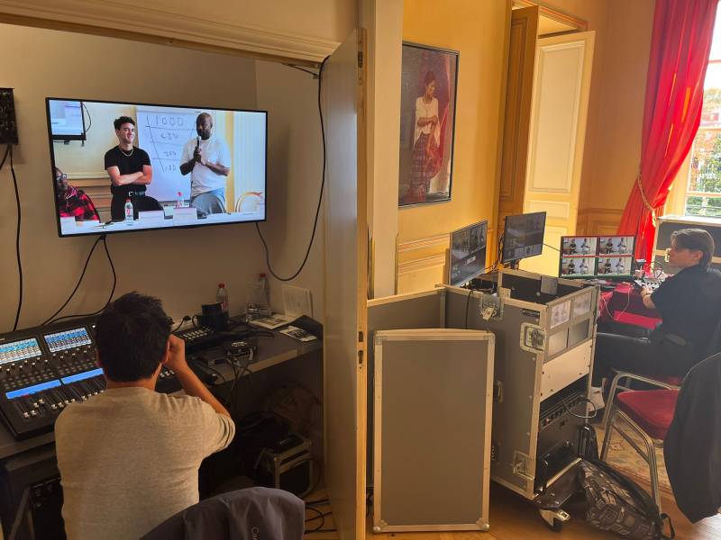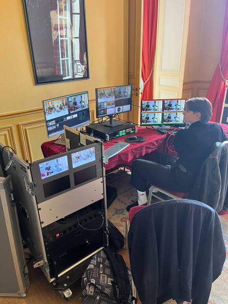 Pour permettre la participation d’intervenants à distance, nous avons mis en place une régie vMix pour la gestion des visioconférences sur Zoom. L’image a été captée avec des caméras tourelles 4K Panasonic, assurant une retransmission nette et fluide des échanges.