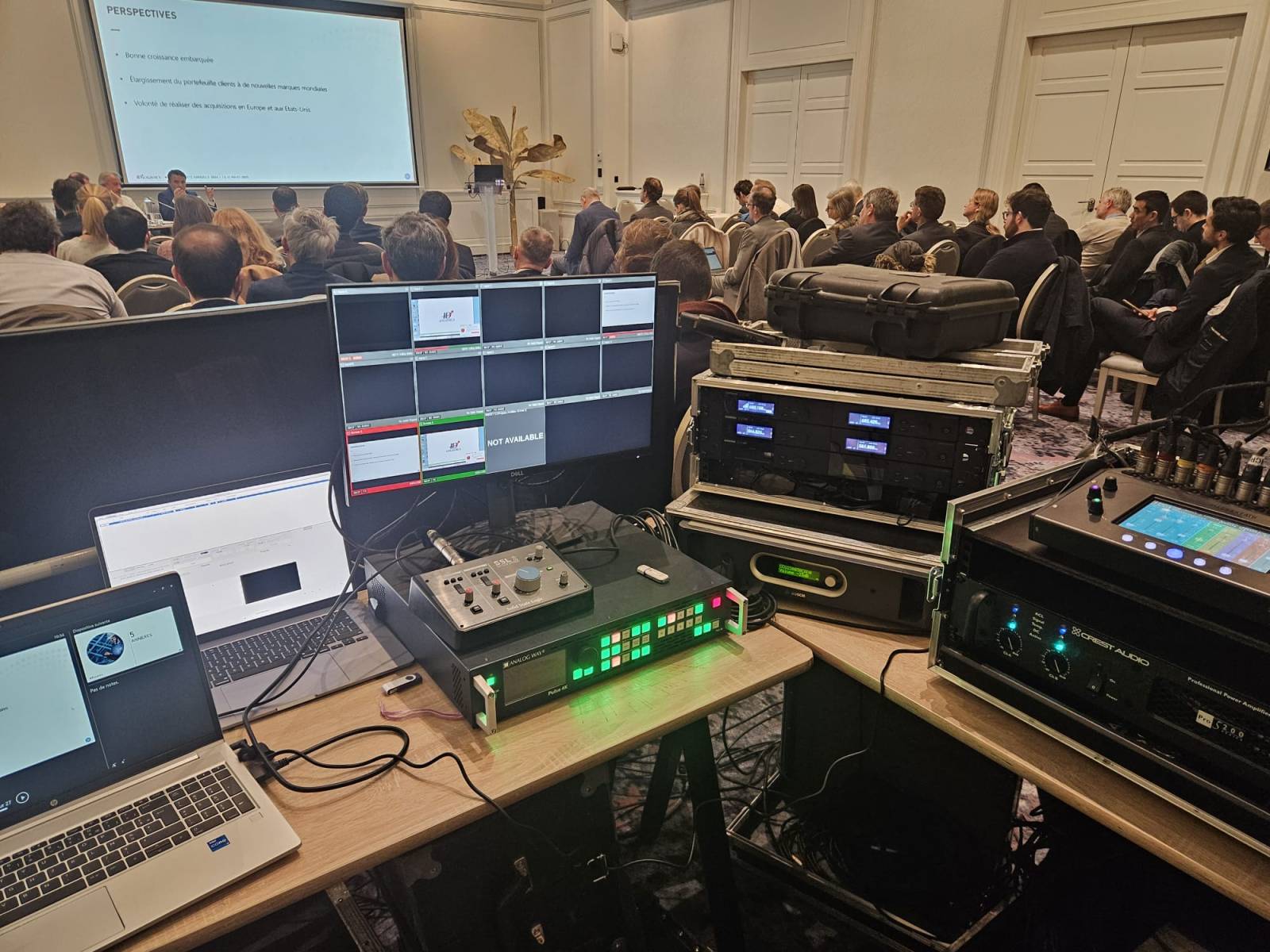 Pour cette mission, nous avons déployé une solution technique complète adaptée aux besoins de diffusion en direct et aux prises de parole des intervenants. La diffusion a été gérée avec le Pulse 4K Analog Way, offrant une commutation fluide entre différents ordinateurs et sources vidéo via PlaybackPro, pour une expérience visuelle dynamique et professionnelle.